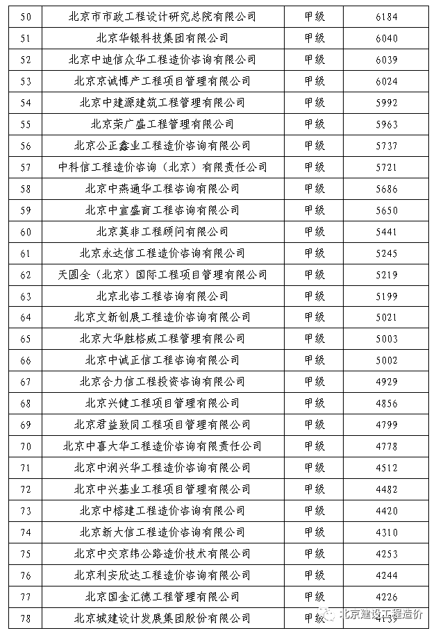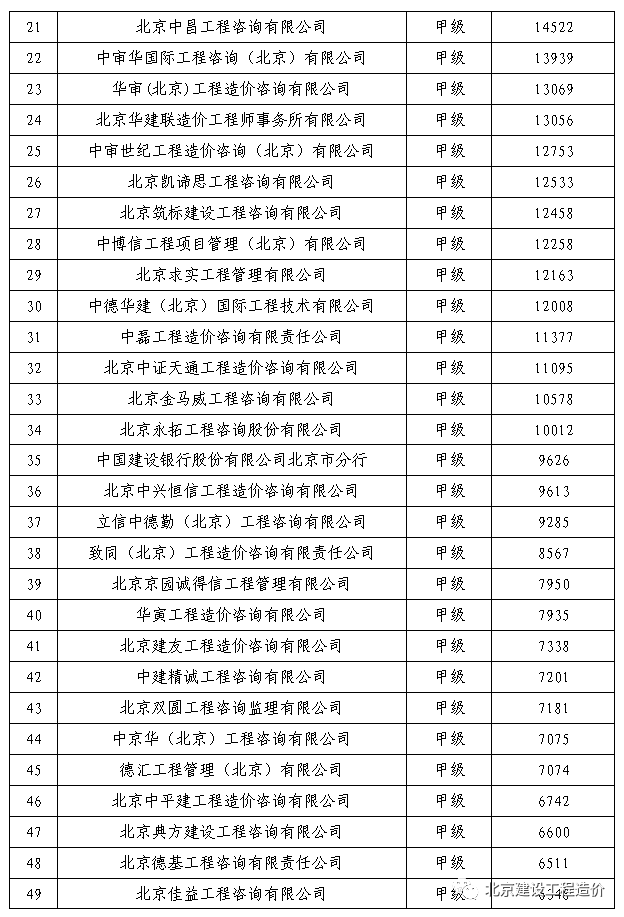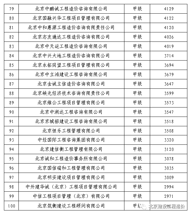 3.根据2018年5月1日正式施行的《北京市工程造价咨询企业及其注册造价工程师市场行为信用评价管理暂行办法》的规定,本次统计的造价咨询收入作为对企业报送业绩信息进行审核的参考依据。现将我市造价咨询收入排序前100名的企业予以公布,如有异议请联系我处。